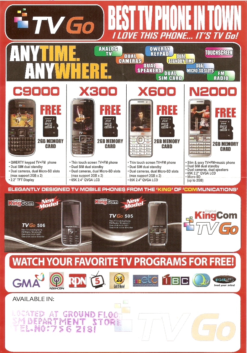 TV phones. Phones with analog TV. Phones where you can watch your favorite TV programs for free. As long as there is signal, of course. They are being sold right now in malls. We found these Kingcom TVGo TV phones in SM City Lipa. Here is the list of Kingcom TVGo units they are selling.